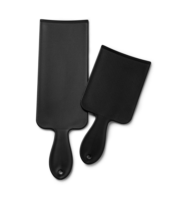 Balayage Board & Paddle Pack 2st. is een set van 2 highlight borden in Large en Medium. De planken bieden versteviging om folie op te plaatsen tijdens het highlights zetten of balayage behandelingen. De medium maat is geschikt voor alle haartypes en de lange plank is ideaal voor balayage in lang haar. De planken hebben een curve aan de bovenkant die perfect de contouren van het hoofd volgt voor preciese applicatie. De ene kant van de highlight boards is glad en de andere getextureerd. De kant met textuur helpt voor extra grip en gemakkelijkere applicatie. De boards zijn gemakkelijk in gebruik en herbruikbaar.