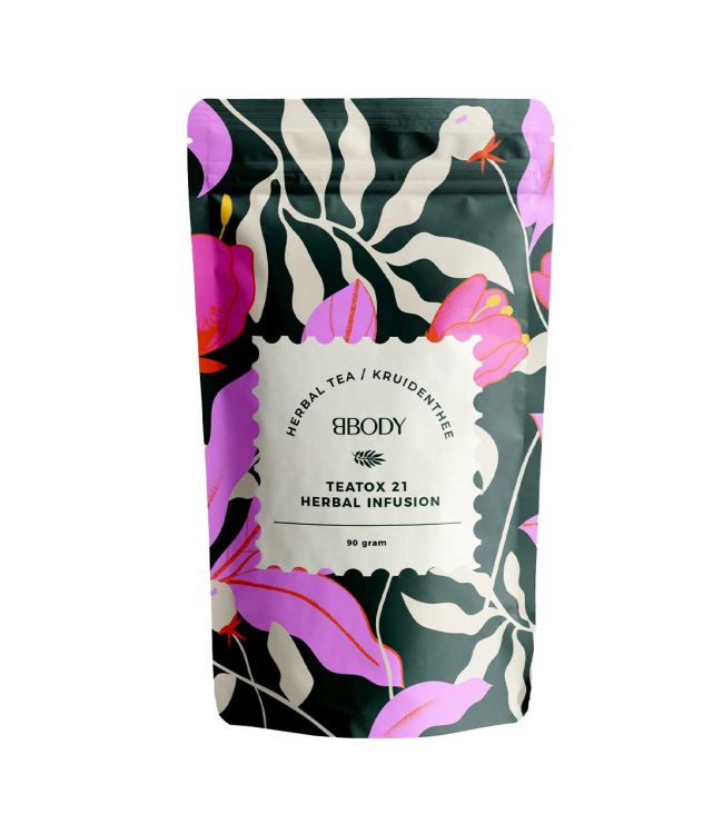 Bbody Teatox 21 Kruidenthee 90gr. is een hoge kwaliteit losse thee met unieke herbal blend. De detox thee geeft het lichaam een grondige reiniging en een boost van energie en vitaliteit. Deze kruideninfusie met onder andere Chinese witte thee, Chinese groene thee, gemberwortel, geroosterde maté heeft een bewezen detox effect dat echt werkt! De thee helpt je om je fitter en energieker te voelen en ook om je algemene gezondheid te verbeteren. Daarnaast helpt de Teatox 21 thee je met afvallen zonder een hongergevoel. Ervaar het verschil in welzijn terwijl je onderweg bent naar een gezondere levensstijl in combinatie met gezonde voeding en 2 liter water per dag.