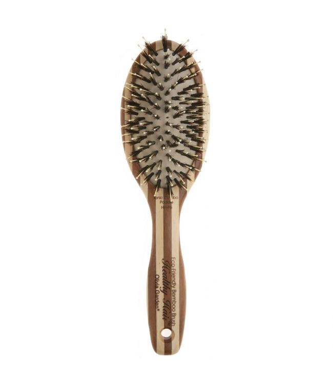 Borstel Olivia Garden Healthy Hair Combo is een bamboo borstel. Deze borstel is zeer geschikt voor stylen en ligt fijn in de hand. Door het unieke design valt deze borstel op en is dit een echte musthave in de salon. De ronde, ergonomische vorm zorgt voor goede grip. De Healthy Hair lijn is een professionele, eco-vriendelijke borstellijn gemaakt van bamboe. Dit materiaal is extreem lichtgewicht en daarom comfortabel in gebruik. Het kussentje is gemaakt van zacht, anti-frizz materiaal wat pluizig haar voorkomt. De haren zijn een combinatie van nylon en natuurlijk varkenshaar. De nylon haren ontklitten het haar gemakkelijk en de boar bristles zorgen voor een zijdezacht en glanzend resultaat.