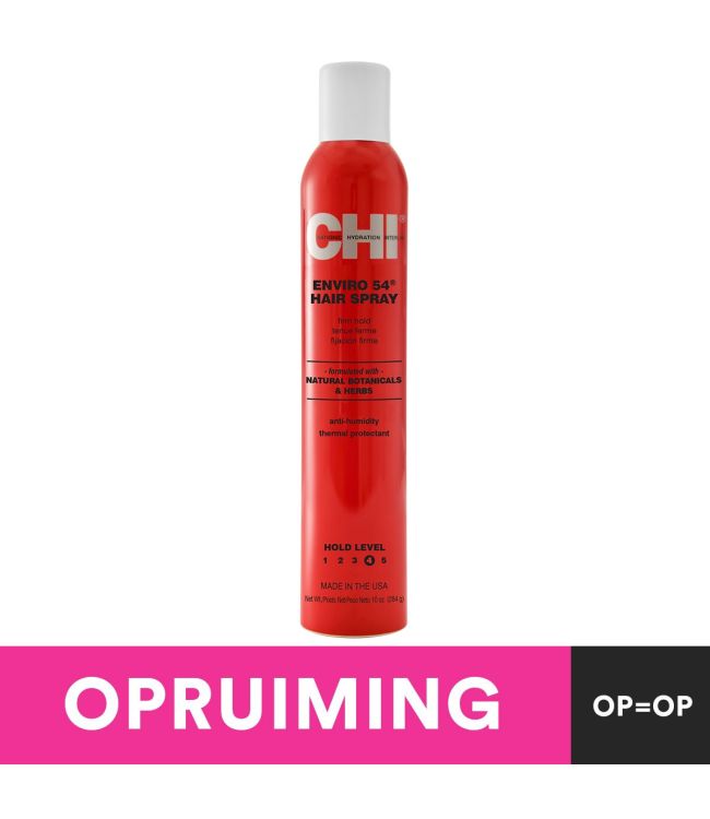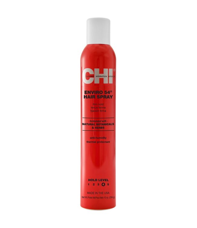 Chi Enviro 54 Hair Spray Firm Hold 284ml is een veelzijdige haarspray met stevige hold. De haarlak is sneldrogend en lichtgewicht, ideaal om iedere style naar wens te creëren zonder het haar te verzwaren. Chi Enviro 54 Hair Spray biedt bescherming tegen luchtvochtigheid waardoor je lang van een pluisvrij resultaat kunt genieten. Ook zitten er in de haarlak hittebeschermende delen die het haar beschermen tegen schade door hitte. De formule is verrijkt met zijde proteïne en botantische ingrediënten en kruiden. Met een holdlevel van 4 uit de 5 blijft het kapsel de hele dag in model. De Enviro 54 spray geeft het haar een prachtige, glanzende finish. De formule is vrij van parabenen.