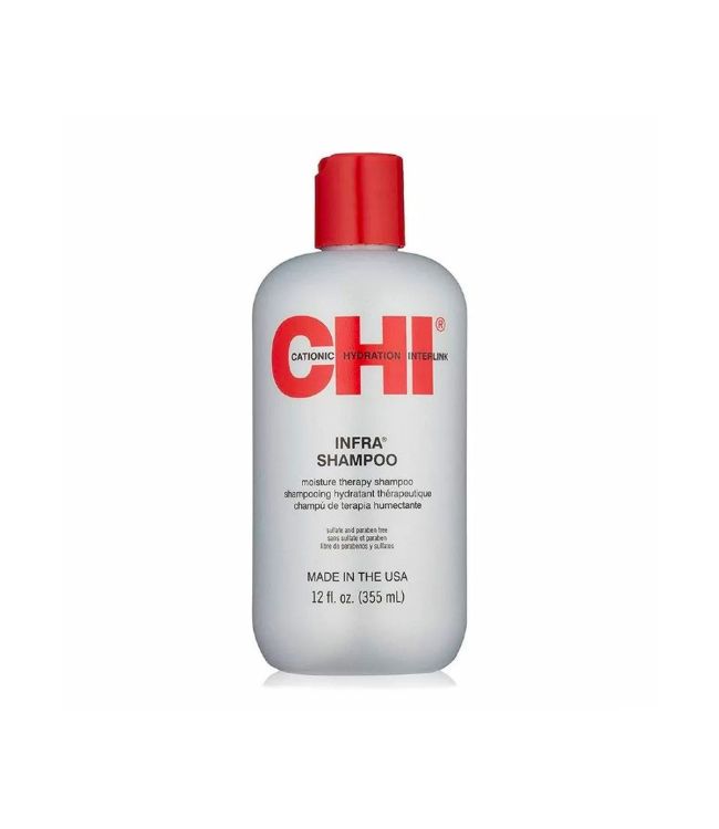 Chi Infra Shampoo 355ml is een diep hydraterende shampoo van CHI. De shampoo reinigt het haar op zachte wijze en herstelt de vocht balans van het haar en hoofdhuid. De shampoo heeft een cationisch hydraterende werking wat zorgt voor een weldaad aan zachtheid na iedere wasbeurt. De vochtinbrengende bestanddelen maken het haar beter handelbaar en de toevoeging van proteïne zorgt voor extra veerkracht. De Chi Infra Shampoo is geschikt voor alle haartypes en voor dagelijks gebruik. Het haar voelt direct gezonder en beter handelbaar. De formule is vrij van parabenen en sulfaten.