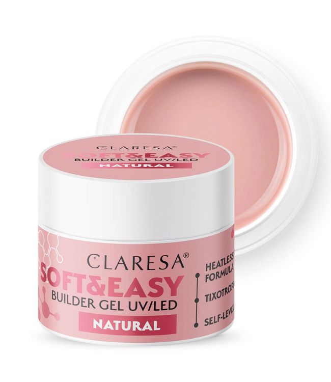 Claresa Keratine Soft & Easy Builder Gel Natural 12gr. is een bouwgel in een natuurlijke nude kleur om de nagels te verlengen, versterken en modelleren. De Soft & Easy Builder Gel brengt super gemakkelijk aan en vereist geen basecoat of topcoat bij applicatie. Veeg enkel de plakkerige dispersielaag met cleaner eraf na het uitharden en de intens glanzende en stevige nagels zijn klaar! De innovatieve gelformule maakt de nagels perfect vlak en vergeeft kleine foutjes. Je kunt snel werken door de thixotropie (vloeibaar geheugen) wat ervoor zorgt dat de gel niet over de nagelriemen vloeit. Natural heeft een zeer natuurlijke nude kleur en een dekking tot 90%.