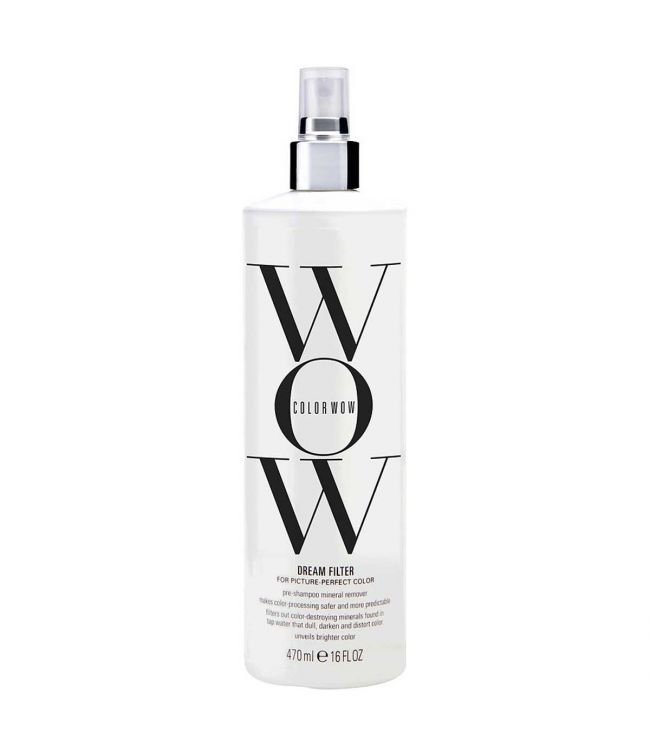 Color Wow Dream Filter Pre Shampoo 470ml is een detox pre-shampoo spray. De detox-spray verwijdert doffe mineralen en verontreinigende stoffen om onmiddelijk een lichtere en heldere haarkleur te onthullen. De zachte behandeling werkt in minder dan 3 minuten en maakt het haar zachter en helderder. Mineralen zijn te vinden in bronwater en hard water. Deze mineralen kunnen het haar donkerder maken en de kleur vervormen. Degelijke mineralen zijn bijvoorbeeld chloorwater, koper, aluminium, ijzer en magnesium. De Dream Filter Pre Shampoo heeft een zachte formule voor gezonder haar en hoofdhuid. Na gebruik van de spray komt de ware kleur van het haar naar boven. Met de Dream Filter Spray kun je de mooie haarkleur of highlights te onderhouden en helderder maken. Ook is de spray ideaal om te gebruiken in de salon, voorafgaand aan een kleurbehandeling. De spray bevat geen peroxide of kleurstoffen.