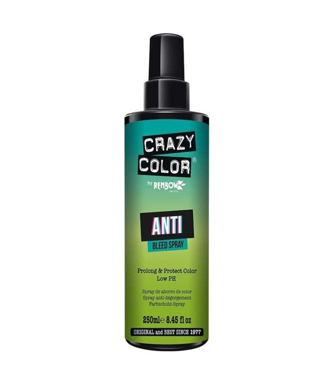 Crazy Color Anti Bleed Spray 250ml is een kleurbeschermende en verlengende spray. De Crazy Color Anti Bleed Spray vergrendelt de haarkleur voor maximaal 10 extra wasbeurten en gaat kleurvervaging tegen. Ook voorkomt de Anti Bleed Spray dat kleuren in elkaar gaan overlopen (bloeden). Dit maakt het mogelijk om geweldige kleuroverlopen te maken. Van een gave ombre tot regenbooghaar, met Crazy Color Anti Bleed Spray wordt het resultaat mooi en strak. De ultra lage pH waarde van de spray verzegelt de haarschubben om de kleur te behouden. Sojaolie geeft het haar een prachtige glans. De formule is vrij van sulfaten en zouten, 100% vegan en dierproefvrij. De spray werkt als een treatment en werkt in slechts 60 seconden. Bij gebruik van de spray heb je geen shampoo of conditioner nodig.