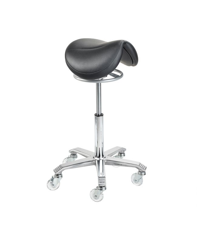 Kappersfiets Jumper Balance Kunstleer Zwart is een kappersfiets van Score geadviseerd door fysiotherapeuten voor mensen met rugklachten. De Jumper Balance kappersfiets is de bredere variant van de Amazone Balance kappersfiets. De Jumper-zitting biedt de optimale balans tussen de controle en gezonde houding van ‘staan’ en het comfort van ‘zitten’. De zadelkruk heeft een anatomisch gevormd zadel, dat het bekken kantelt en zorgt voor een ontspannen rughouding. Het instelbare Balance mechaniek beweegt mee in de richting van de gebruiker waardoor men als het ware balanceert op de zadelzitting. Deze actieve manier van zitten bevordert de doorbloeding en traint en versterkt de rugspieren. De kappersfiets is in hoogte verstelbaar en heeft een bekleding van zwart kunstleer. De stervoet is gemaakt van gepolijst aluminum en heeft een doorsnede van 54cm.