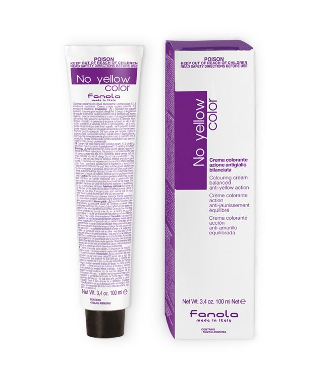 No-Yellow Color haarverf van Fanola is de nieuwe professionele lijn van exclusieve, technische producten voor blond haar, gebleekt en opgefrist voor het produceren van pure, absolute en onberispelijke blondines. Het assortiment biedt een kleur- en ontkleuringsysteem dat het ongewenste vergelingseffect tijdens de kleuring in de salon kan optimaliseren en neutraliseren.
