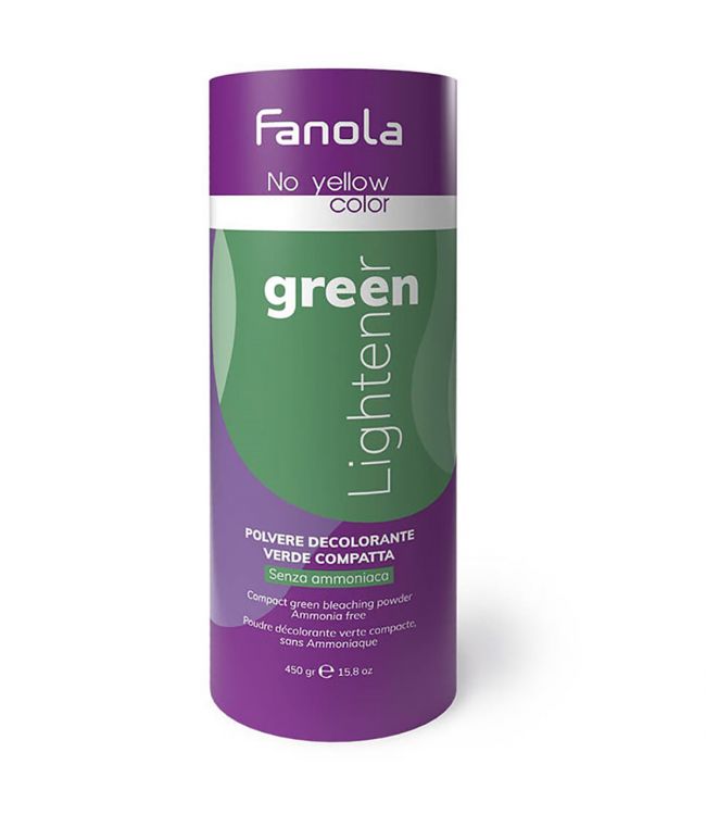 Fanola No Yellow Color Green Lightener Poeder 450gr. is een ammonia-vrije blondeerpoeder met groene pigmenten. De stuifvrije blondeerpoeder licht het haar geleidelijk op tot 5 tinten. Deze professionele blondeerpoeder is volledig toegewijd aan blond, geblondeer en opgelicht haar om pure, absolute en onberispelijke blondtinten te creëren. Het groen pigment helpt om rode warme gloed te neutraliseren. De Green Lightener Powder is vooral geschikt voor mensen met een ammoniak allergie. Meer Lezen