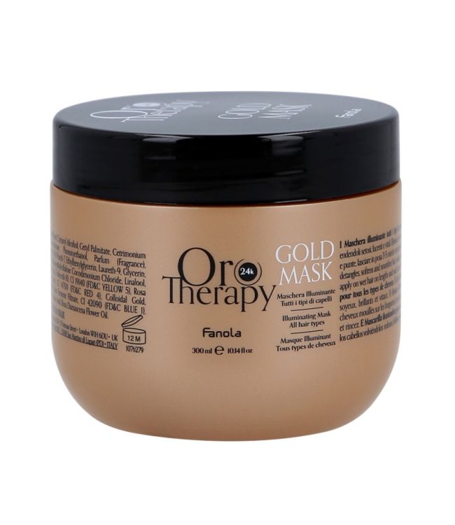 Fanola Oro Therapy Gold Mask 300ml is een illuminerend haarmasker met microactieve 24 Carat Gold, Keratine en Arganolie. Het Gold Mask is geschikt voor alle haartypes en zorgt voor geweldige glans, zachtheid en krachtig haar door het haar intensief te voeden. Dit haarmasker is ontworpen om kroezen en gespleten haarpunten tegen te gaan. Fanola Oro Therapy Gold Mask is gemaakt met microactief goud om glans aan de strengen te geven en het haar te herstructureren. Fanola Oro Therapy Gold Mask gaat kroezen en pluis tegen, voedt het haar en maakt het glanzend en zijdezacht. Het illuminating masker herstelt de vitaliteit van het haar en repareert schade van chemische behandelingen en vrije radicalen.