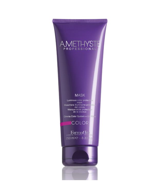 FarmaVita Amethyste Color Mask 250ml is een kleurbeschermend haarmasker voor gekleurd haar. Het masker zorgt ervoor dat de haarkleur minder snel vervaagt. Daarnaast beschermt het masker het haar en zorgt het voor verbeterde sterkte, volume, glans en textuur. De formule is verrijkt met het innovatieve Omnia Color System, wat bewezen kleurvervaging minimaliseert, het haar sterker maakt en hydrateert. Meadowfoam Seed Oil is rijk aan natuurlijke oxidanten en zuren die ervoor zorgen dat de haarkleur intens en glanzend blijft. De olie dringt diep door in het haar om de structuur te verbeteren en het haar sterker te maken. Panthenol geeft het haar een hydratatie boost en een UV-filter beschermt de haarkleur tegen agressieve UV-straling. FarmaVita Amethyste Color Mask zorgt ervoor dat de haarkleur langer mooi en verzorgd blijft.