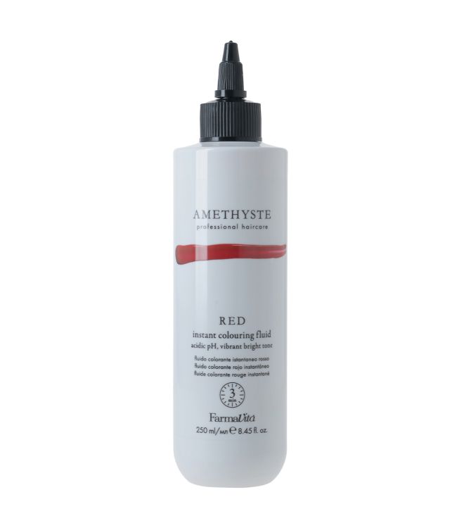 FarmaVita Amethyste Instant Colouring Fluid Red 250ml is een semi-permamente, directe, vloeibare kleuring voor ongelooflijk levendige, rijk een glanzende resultaten in slechts 3 minuten. De unieke vloeistof op gelbasis zorgt voor intense en briljante kleurresultaten. De Instant Coulouring Fluid biedt grijsdekking tot 40% en is ideaal om de eerste grijze haartjes te maskeren. De delicate formule heeft een zure pH-waarde van <6.5 en werkt zelfs op donkere basissen (behalve Frozen Lilac en Gold Blonde). Dankzij de snelle inwerking van 3 minuten kun je tijd besparen in de salon.