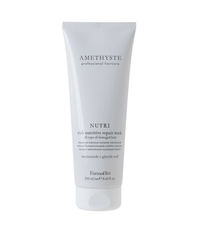 FarmaVita Amethyste Nutri Rich Nutritive Repair Masker 250ml is een verzorgend en herstellend haarmasker voor beschadigd haar. Het haarmasker is verrijkt met Niacinamide + Glycolic Acid om de haarstructuur te repareren en versterken, waardoor het haar weer zacht en glanzend wordt. FarmaVita Amethyste Nutri is geschikt om alle soorten droog en beschadigd haar te verstellen over de gehele lengtes tot in de puntjes.