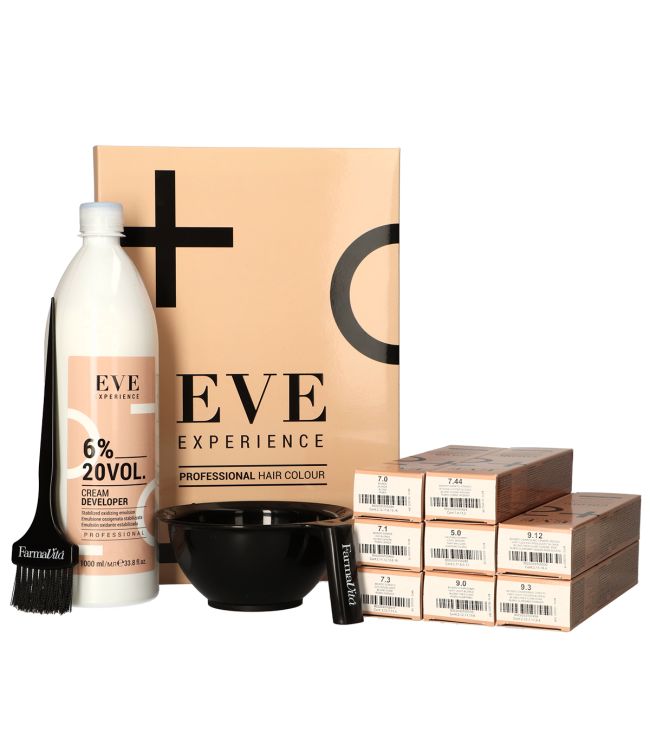 FarmaVita EVE Experience Kleuren Proefpakket met Kleurboek is een proefpakket van de kleuring van Farmavita EVE Experience. FarmaVita EVE Experience 100ml is een permanente haarkleuring die vrij is van PPD en Resorcinol en met een minimale hoeveelheid ammonia. De gebalanceerde, schone en groene formule zorgt voor perfecte kleurresultaten met 100% grijsdekking en is zacht voor het haar en de huid. De zachte en veilige formule is voor zowel klanten als stylisten een aanwinst.