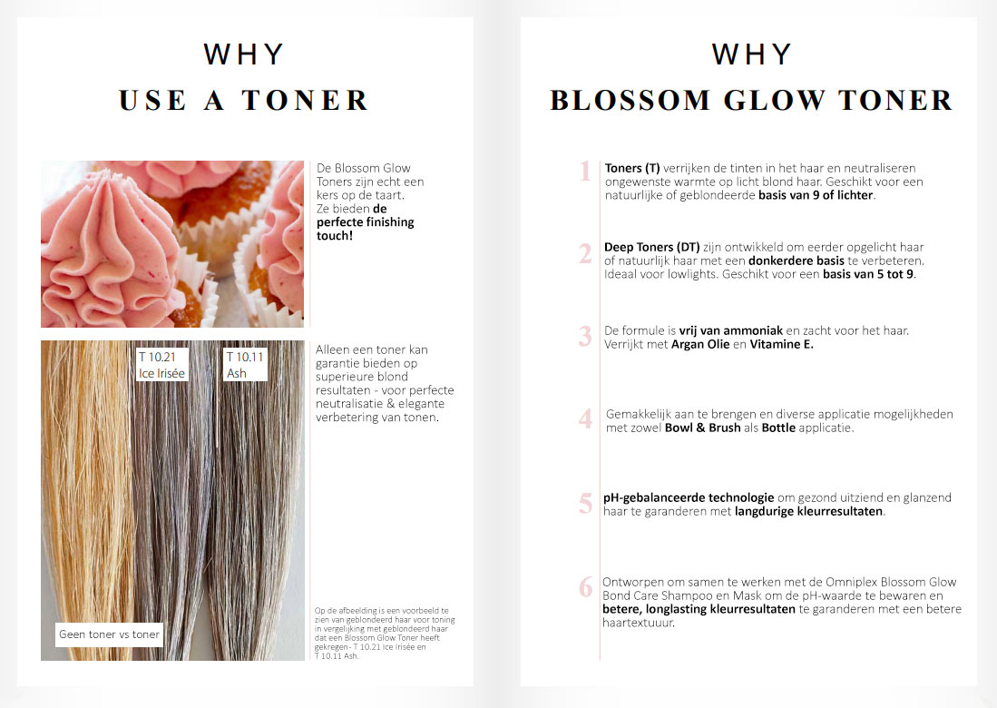 De Blossom Glow Toners hebben een zeer zachte formule die vrij is van ammoniak en alcohol. De schadevrije formule is verrijkt met Omniplex bonding technologie en is pH-geoptimaliseerd voor zo min mogelijk schade aan het haar tijdens het tonen. Wat de Blossom Glow Toners écht uniek maakt is dat de kleur tot wel 6 weken zichtbaar is indien deze wordt verzorgd met de Blossom Glow Bond Care Shampoo! Ontdekt het zelf.