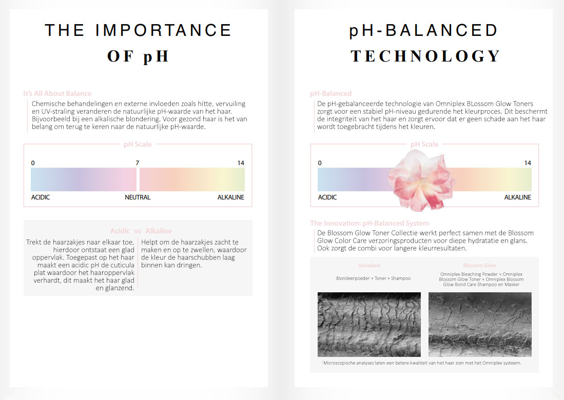 De Toners uit de Blossom Glow Collectie zijn een echte kers op de taart en bieden de perfecte finish aan blondresultaten. Ideaal voor het neutraliseren van ongewenste warmte of het benadrukken van elegante tonen. De formules zijn vrij van ammoniak, directe kleurstoffen en alcohol én verrijkt met Arganolie en Vitamine E voor gezond en glanzend haar. De romige formule is gemakkelijk aan te brengen en geschikt voor zowel Bowl & Brush technieken als Bottle applicaties. Bovendien zijn de toners ook 100% veganistisch. Chemische behandelingen en externe invloeden zoals hitte, UV-straling en vervuiling kunnen de pH-waarde van het haar veranderen, zoals een alkalische blondering. De pH-gebalanceerde technologie van Omniplex Blossom Glow Toners zorgt voor een stabiel pH-niveau tijdens de kleurbehandeling. Dit beschermt de integriteit van het haar en voorkomt schade tijdens het kleurproces. Dus ben je op zoek naar een long-lasting toner die geen schade aan het haar toe brengt? Ontdek dan de Omniplex Blossom Glow Toner Collectie!
