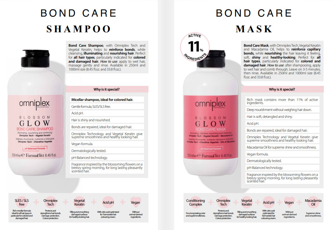 De Blossom Glow collectie is uitgebreid met een bijpassende shampoo en haarmasker. Door deze producten te gebruiken na een kleurservice met de Blossom Glow Toners verleng je het kleurresultaat tot wel 6 weken. De Bond Care Shampoo en het Bond Care Mask zijn ook losstaand te gebruiken. De verzorgingsproducten zijn geschikt voor alle haartypes, maar vooral voor gekleurd en/of beschadigd haar. Door de Omniplex Bonding Technologie met Vegetal Keratine worden de bindingen in het haar herstelt. Het resultaat is zacht, glanzend, sterker en gezond haar. De Bond Care producten zijn verkrijgbaar in 250ml en 1000ml.