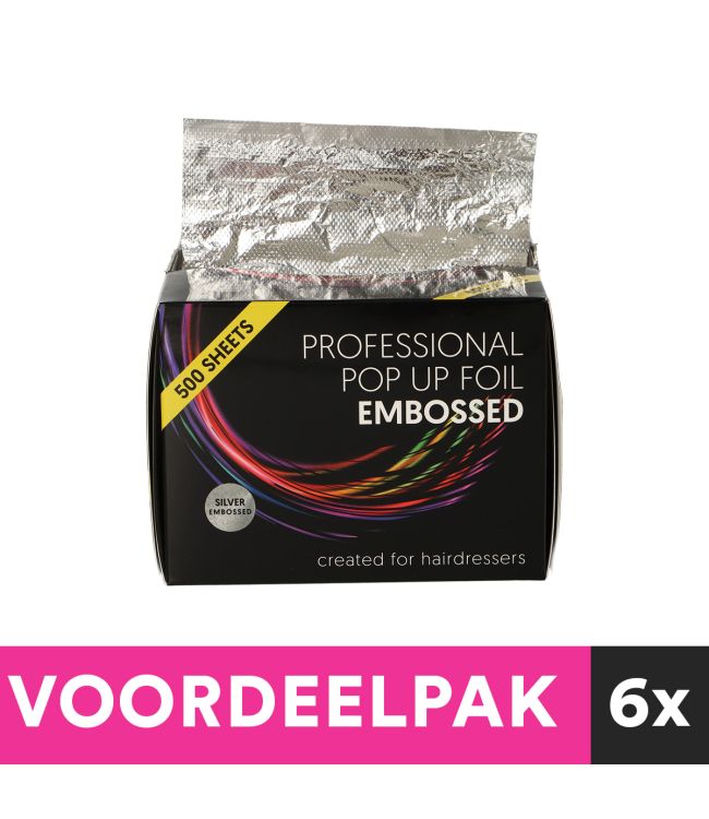 Folie Aluminium Embossed 12.7 x 27.3cm Zilver 500 vellen 15MU is een doosje met daarin een vellen folie van 12,7cm breed, 27,3cm lang en 15MU dik. Deze verpakking bevat 500 folie vellen. De folie is gegaufreerd voor anti-slip. Het reliëf in de folie geeft extra grip en zorgt ervoor dat de folies niet wegglijden uit het haar. De Embrossed folie vellen zijn ideaal voor highlights en haarkleuringen. Op de bovenkant van het doosje zit een opening waar de vellen gemakkelijk uitgehaald kunnen worden. Meer Lezen