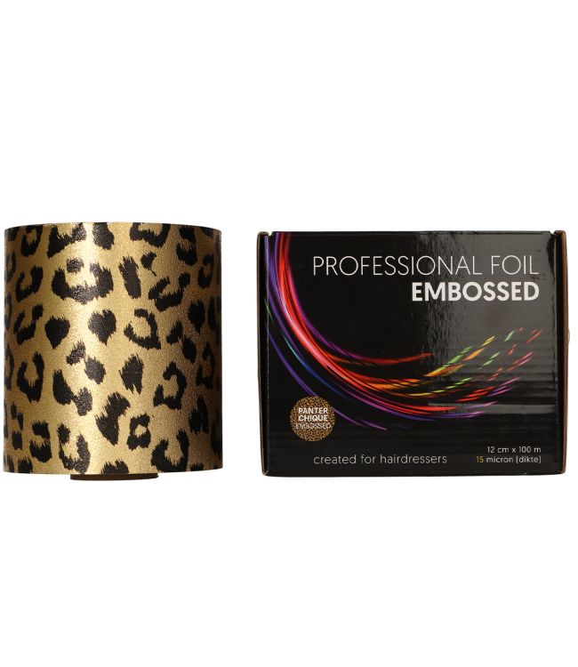 Folie Aluminium Rol Panter Chique Embossed 12cmx100m 15MU is een aluminiumfolie rol van 12 centimeter x 100 meter met een gemiddelde dikte van 15 micron. Deze aluminiumfolie op rol is ideaal, omdat je zelf de lengte van de folie kunt bepalen. Kies de gewenste lengte en snij deze eenvoudig af met het scherpe kartelmes dat op het randje van de dispenserdoos is bevestigd. Deze folie maakt het werken een stuk leuker door de Panter Chique panterprint. De combinatie van dierenprint op een gouden achtergrond creëert een blij gevoel bij zowel de klant als bij jou. Bovendien vraagt deze folie gewoon om een selfie tijdens het inwerken van de behandeling.