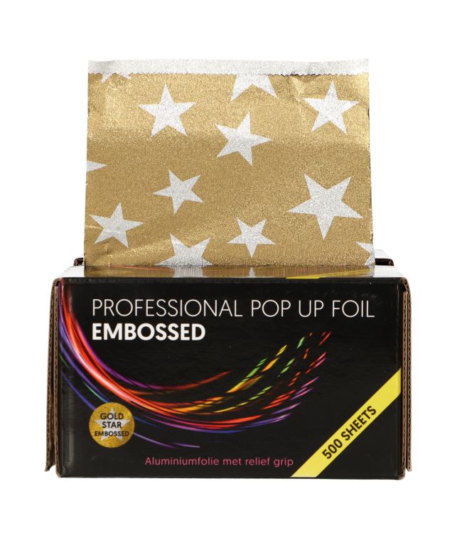 Folie Aluminium Voorgesneden Gold Star Embossed 13x27cm 15MU 500st. is een doos met 500 sheets van 13 x 27 centimeter aluminium folie met een gemiddelde dikte van 15 micron. Deze aluminiumfolie is al in 500 stukken gesneden, waardoor je snel en eenvoudig aan het werk kunt zonder gedoe. Deze folie maakt het werken een stuk leuker door de Gold Star print. De combinatie van glimmende zilveren sterren en een gouden achtergrond creëert een blij gevoel bij zowel de klant als bij jou. Bovendien vraagt deze folie gewoon om een selfie tijdens het inwerken van de behandeling.