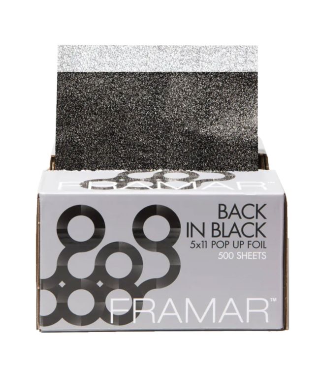 Framar Back in Black Pop Up Folie 500 Sheets is een doos met 500 stuks voorgesneden en gevouwen vellen aluminiumfolie. De Pop Ups zijn ideaal om tijd te besparen, omdat je ze niet hoeft te snijden. Met de reeds gevouwen rand kun je een stuk sneller werken zonder gedoe. De Framar Back in Black is een prachtige rol met zwarte folie. De unieke folie geeft de klant een volledige experience en vraagt gewoon om een selfie tijdens het inwerken van behandelingen. De reliëftextuur geeft extra anti-slip grip op het haar, waardoor de folie niet uit het haar glijdt. De folie van Framar wordt geleverd in een matchende dispenserdoos. De folies glijden gemakkelijk uit de doos en zijn direct op het haar aan te brengen. De embossed aluminiumfolie is erg buigbaar en daarom gemakkelijk aan te brengen en te vormen naar de contouren van het hoofd. Framar Back in Black Pop Up Folie is geschikt voor het creëren van highlights, lowlights en balayage. De folies hebben een gemiddelde dikte van 15MU. De aluminium folie vellen hebben een afmeting van 12,7 x 27,9 cm (5 x 11 Inch). Met Framar folie is elke service een unieke ervaring en een fluitje van een cent.