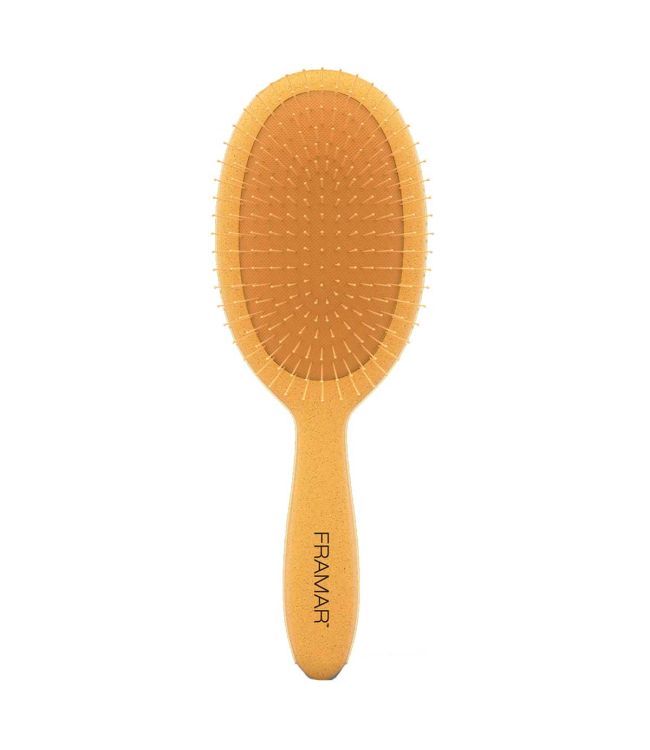 Framar Detangle Brush Baecation Sand ontdoet het haar van klitten en knopen in stijl. Deze haarborstel heeft flexibele pinnen waarmee je pijnloos en eenvoudig het haar kunt ontwarren. De borstel is geschikt om te gebruiken op zowel nat als droog haar. De Detangle Brush is geschikt voor alle haartypes en ook te gebruiken op pruiken en extensions. De borstel is niet geschikt om te gebruiken in combinatie met hitte. Deze okergele borstel met gouden details komt uit de Baecation collectie van Framar. Baecation is geïnspireerd op de Honeymoon naar Hawaii in de jaren '80 van de Framar Founders Frank en Maria. Deze zandkleurige borstel doet je denken aan een zomers strand. Extra speciaal is dat deze Detangle Brush gemaakt is van natuurlijke tarwevezels.