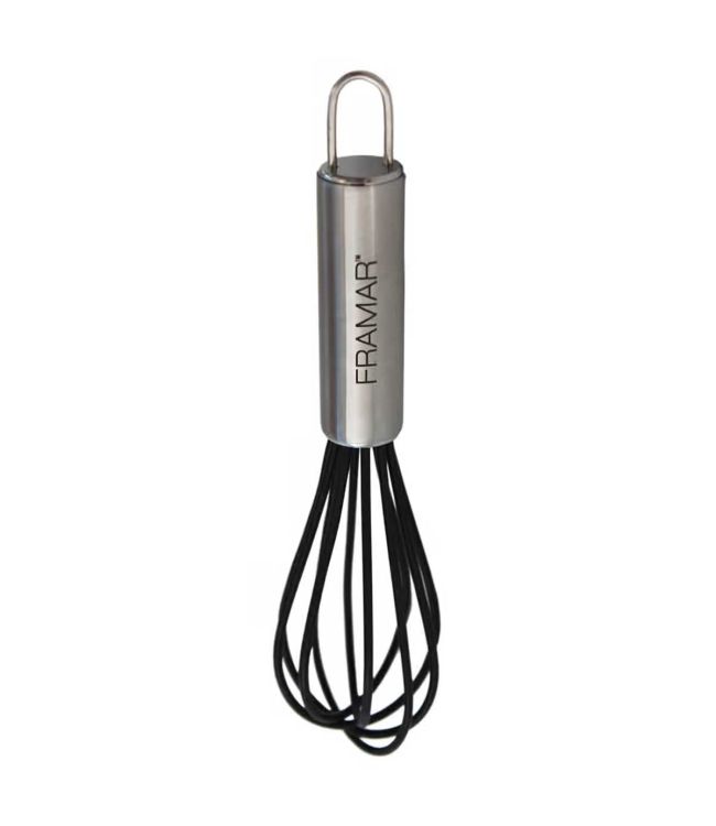 Framar Mighty Mixer Color Whisk is een compacte garde van Framar voor het mengen van haarverf of blondering met oxidatie. Deze garde heeft een handvat van roestvrij staal en rubberen loops waarmee je eenvoudig homogene mengsels creëert. Doordat de loops van rubber zijn zal het de haarkleur niet beïnvloeden, wat wel het geval kan zijn met een garde van metaal. De garde is klein en compact, waardoor deze handig in gebruik is én niet onnodig veel ruimte in beslag neemt op je werkwagen. De garde heeft een haak waaraan deze kan worden opgehangen.