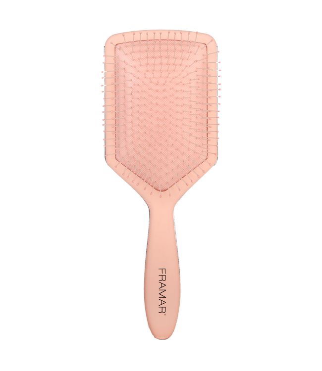 Framar Paddle Brush Champagne Mami ontdoet het haar van klitten en knopen in stijl. Deze grote paddle brush heeft flexibele tanden waarmee je zowel droog als nat haar eenvoudig kunt ontwarren. Door het grote formaat kun je sneller groten delen van het haar borstelen. De Paddle Brush is geschikt voor alle haartypes en ook te gebruiken op pruiken en extensions. Ook is de Paddle Brush ideaal voor lang en/of dik haar. De borstel is niet geschikt om te gebruiken in combinatie met hitte. De luxe Champagne Mami borstel heeft een matte lichtroze kleur met chique glanzende rosé gouden accenten aan de zijkant.