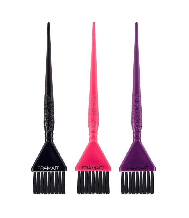 Framar Triple Threat Brush Set 3st. is een set preciese verfkwasten van Framar. De Triple Threat Color Brushes zijn ideaal voor detailwerk zoals root tapping, preciese blends en babylights. De beroemde AccuSoft borstelharen lopen taps toe en zijn ideaal om haarverf op te pakken en gelijkmatig, precies en snel aan te brengen op het haar. De Triple Threat Color Brush een kleinere maat, waardoor deze uitermate geschikt is voor detailwerk. De set bevat 3 kwasten in een roze, paarse en zwarte kleur. De kwasten liggen ergonomisch in de hand en hebben een taps toelopend handvat met punt die gebruikt kan worden om secties in het haar te maken.