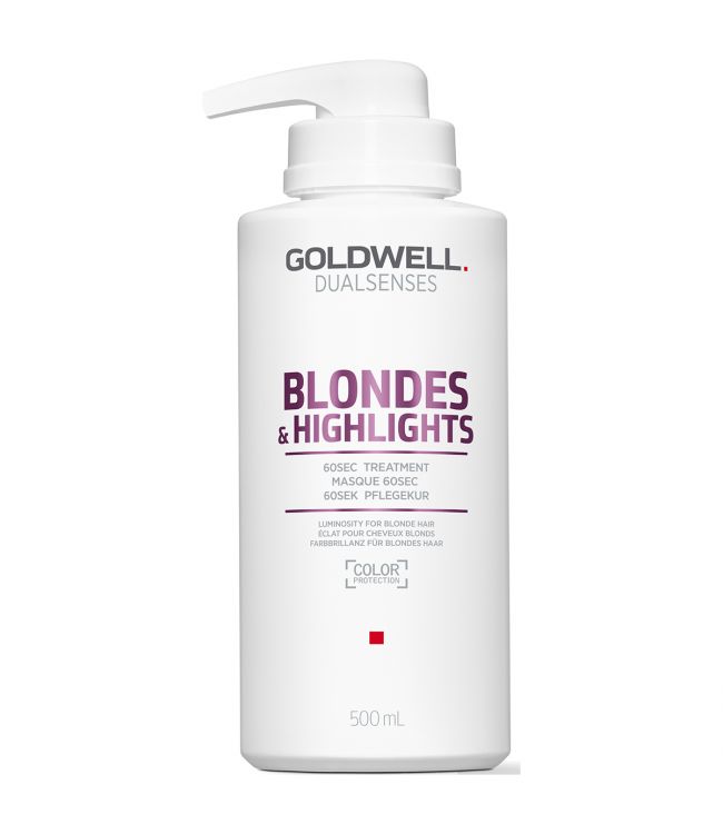 Goldwell Dualsenses Blondes & Highlights 60-Sec Treatment 500ml is een regenererende verzorging voor blond en geblondeerd haar. Het Goldwell Dualsenses Blondes en Highligts Anti-Yellow 60 sec Treatment is geschikt voor zowel natuurlijk blond, blond haar met highlights als geblondeerd haar. Het masker regenereert het haar direct in 60 seconden. Deze 60 seconden treatment neutraliseert ongewenste geeltinten, het zogenaamde No-Yellow effect, geeft extra verzorging, geeft haar haar zichtbaar meer glans en maakt het haar soepel. Resultaat: Binnen 60 seconden intensief verzorgd blond haar en een koele blonde kleur.