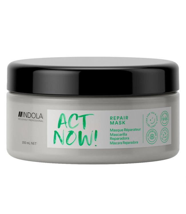 Indola Act Now Repair Masker 200ml is een herstellend en versterkend haarmasker voor beschadigd, dof en droog haar. Het masker sluit de schubbenlaag en versterkt de haarstructuur. Het resultaat is herstelde zachtheid en vitaliteit van het haar. De formule is verrijkt met natuurlijke ingrediënten, zoals koudgeperste Avocado-olie en Shea boter. Daarnaast is het haarmasker vrij van sulfaten, parabenen, siliconen en kunstmatige kleurstoffen. De formule is 100% vegan en de verpakkig is volledig recyclebaar en gemaakt van 96% gerecycled materiaal. Indola Act Now Repair Mask is goed voor het haar en voor het milieu. Het resultaat is intensief gevoed en versterkt haar met een prachtige glans.