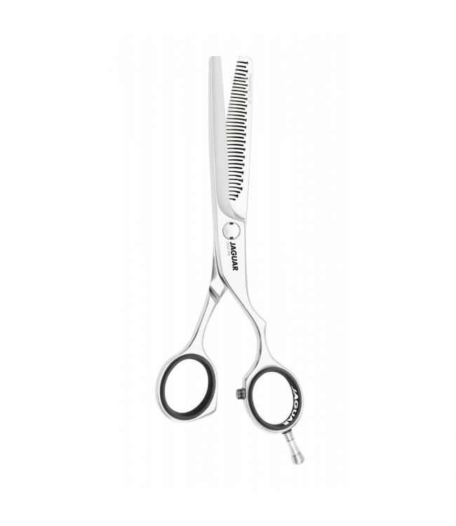 Jaguar Solingen Diamond E Effileer CC39 Kappersschaar 5.5 is een coupeschaar die is voorzien 39 effileermicrotanden met een zeer fijne prismavertanding waardoor een aangenaam zacht gevoel ontstaat met een zeer precieze snit. De ergonomische offset grip met afgehoekt duimoog zorgen voor een ontspannen en pijnvrije werkhouding.