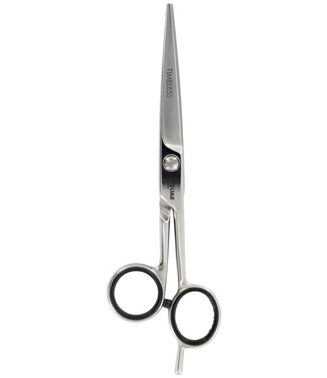 Jaguar Solingen Timeless Kappersschaar 6.0 is een schaar met een offset design voor een ergonomische greep en een ontspannen werkhouding. Het slanke, naar voren spits toelopende schaarblad loopt over in de halmen met aangezet pink steun. Het ronde duimoog stimuleert een ergonomische hantering van de schaar.