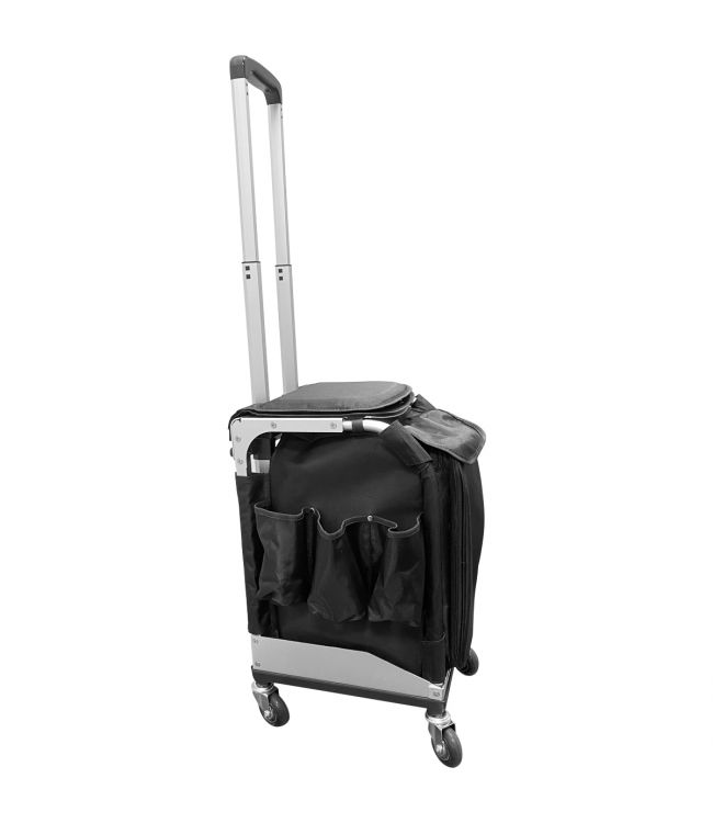 Kapperskoffer Trolley Zwart is een kapperstrolley met trekbeugel en skeelerwieltjes. Dankzij de wieltjes is de koffer gemakkelijk te verplaatsen. De koffer heeft een stoere uitstraling en soepele skeelerwieltjes. Aan de zijkant zitten 3 opbergvakken voor losse spullen. Het hoofdvak is afsluitbaar met een rits. De binnenkant is verdeeld in 3 vakken met klitteband, waardoor de verdeling ook te verwijderen is voor een grote inhoud. Ook zit er een kunststof opbergbakje in de binnenkant.