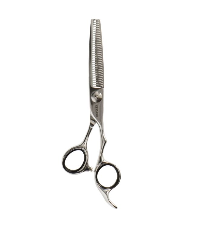 Kessaku Effileerschaar Masterline AK003 6.0 is een effileerschaar gemaakt van een zeer hoge kwaliteit. Deze schaar is gemaakt van stainless Japanese Steel, waardoor deze schaar erg soepel knipt en een lange levensduur heeft. De effileerschaar heeft 30 tandjes met aan het uiteinde een klein haakje. Dit zorgt voor extra grip, waardoor de schaar niet uit het haar glijdt tijdens het effileren. De Kessaku AK003 Masterline kappersschaar is convex, hol geslepen voor scherpe en perfecte prestaties. Deze schaar heeft een licht ergonomisch design met een vaste pinksteun en een gebogen snijblad. Deze kappersschaar is offset en heeft een stelschroef met een kogellager systeem.