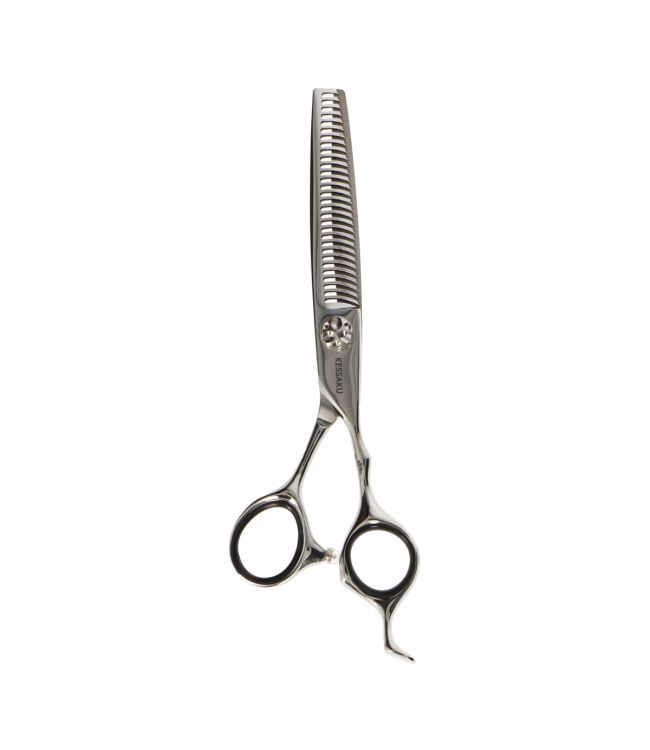 Kessaku Effileerschaar Masterline RH051 Diamond Screw 6.0 is een effileerschaar gemaakt van een zeer hoge kwaliteit. Deze schaar is gemaakt van stainless Japanese Steel, waardoor deze schaar erg soepel knipt en een lange levensduur heeft. De RH051 is een extra luxe uitvoering met chique diamond screw. Deze schroef heeft een mooie, diamant geslepen schroef die er extra luxe uit ziet. De effileerschaar heeft 30 tandjes met aan het uiteinde een klein haakje. Dit zorgt voor extra grip, waardoor de schaar niet uit het haar glijdt tijdens het effileren. De Kessaku RH041 Masterline kappersschaar is convex, hol geslepen voor scherpe en perfecte prestaties. Deze schaar heeft een licht ergonomisch design met een vaste, platte pinksteun en een gebogen snijblad. Deze kappersschaar is offset en heeft een Diamond Screw stelschroef met een kogellager systeem.