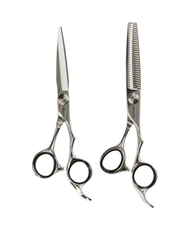 De Kessaku Masterline AK003 is gemaakt van een zeer hoge, premium kwaliteit. Deze scharen zijn gemaakt van stainless Japanese Steel, waardoor deze scharen erg soepel knippen en een lange levensduur hebben. De Masterline van Kessaku is convex, hol geslepen voor scherpe en perfecte prestaties. De effileerschaar heeft 30 tandjes met aan het uiteinde een klein haakje. Dit zorgt voor extra grip, waardoor de schaar niet uit het haar glijdt tijdens het effileren. Beide scharen hebben een licht ergonomisch design met een vaste pinksteun en een gebogen snijblad. De scharen zijn offset en hebben een stelschroef met een kogellager systeem.