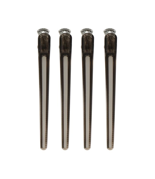 Klem Ganzebek Zwart 4st. is een set van 4 kunststof klemmen in een smokey zwarte kleur. Deze klemmen hebben een anti-slip handgreep die extra grip geeft tijdens het werken. Aan de binnenkant zit een rubberen gedeelte wat eventueel ook verwijderbaar is. Met het rubber kun je het haar wegzetten zonder knikken of drukplekken. Haal het rubber weg en je kunt gebruik maken van de kleine tandjes aan de klem. De tanden geven goede grip op het haar. De klemmen zijn te gebruiken bij alle haardiktes.