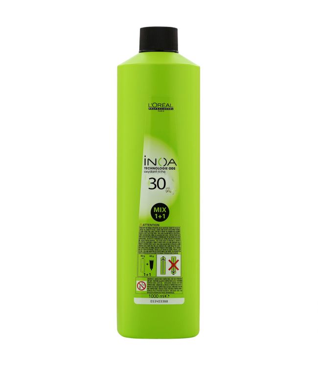 L'Oréal Oxydant Creme 9% (30 vol) 1000ml is een waterstofperoxide voor alle L'Oréal Professionnel permanente haarkleuringen. Deze L'Oréal ontwikkelaar heeft een percentage van 9% of ook genoemd 30 VOL. en is specifiek gemaakt voor het verfijnen van INOA, INOA SUPREME, INOA GLOW en INOA CARMILANE. Deze oxidant is verkrijgbaar in 3 sterktes. De waterstof is geschikt voor permanente haarkleuringen. De oxidant wordt aan de haarkleuring toegevoegd voor een extra intense en glanzende kleur. L'Oréal Oxydant Creme haalt de eigen haarkleur uit het haar, waardoor de nieuwe kleur een betere onderlaag heeft en beter pakt. De oxydant creme kan op een 1:1 verhouding gemend worden.