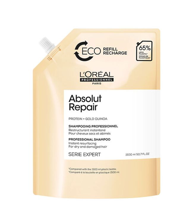 L'Oréal Serie Expert Absolut Repair Gold Quinoa Proteïne Shampoo 1500ml Refill is een handige navulling voor de Absolut Repair Shampoo. De ecologische navulling is gemaakt van 65% minder plastic in vergelijking met een 1500ml L'Oréal Serie Expert fles. Bovendien is de refill verpakking 100% recyclebaar.