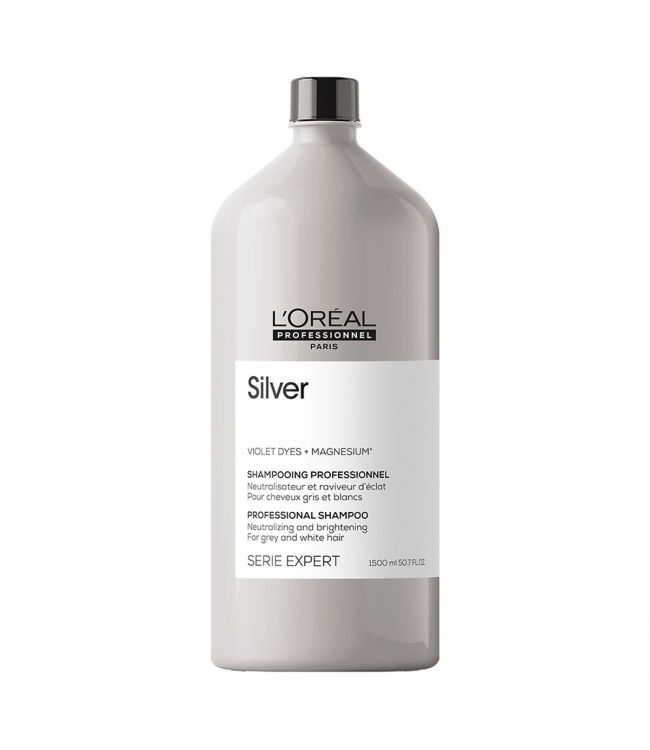 L'Oréal Serie Expert Magnesium Silver Shampoo 1500ml is een shampoo speciaal voor grijs en wit haar. Deze zilvershampoo neutraliseert gele tonen in grauwkleurig haar en geeft grijs of wit natuurlijk haar weer een stralende glans. L'Oréal Serie Expert Magnesium Silver Shampoo zorgt ervoor dat het haar weer soepel en glad wordt en de kleur weer opgefrist. De Silver Shampoo heeft een sterk violet pigment voor het neutraliseren van ongewenste warmte en gele gloed. Meer Lezen