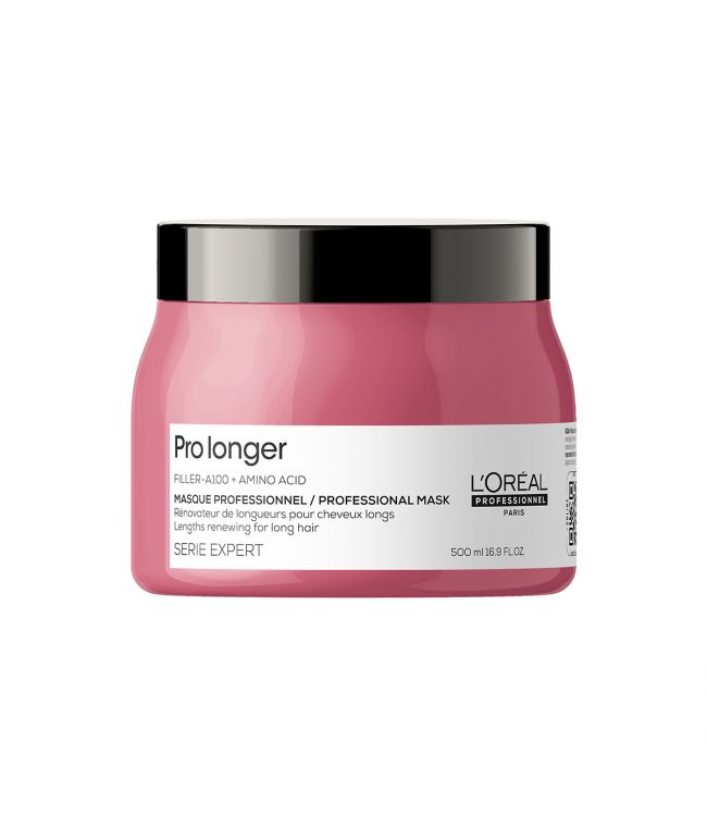 L'Oréal Serie Expert Pro Longer Masker 500ml is een haarmasker voor sterkere lengten van lang haar. De Serie Expert Pro Longer lijn van L'Oréal is de perfecte behandeling voor lang haar met verdunde punten. De formule is verrijk met Filler A100 technologie en Aminozuur om de lengten te vernieuwen en punten te verdikken. Filler A100 is een gepatenteerde technologie van L'Oréal Professionnel en dringt door in de vezel om de punten voller te maken en de haren te beschermen tegen invloeden van buitenaf. Aminozuur geeft kracht aan de vezel voor langer, dikker en beter haar. Na regelmatig gebruik van L'Oréal Pro Longer zijn de resultaten 94%minder haarbreuk, 17% minder gespleten haarpunten en 5x meer glans. Daarnaast verbetert het Pro Longer masker ook de doorkambaarheid van het haar. Keep it longer met L'Oréal Pro Longer.