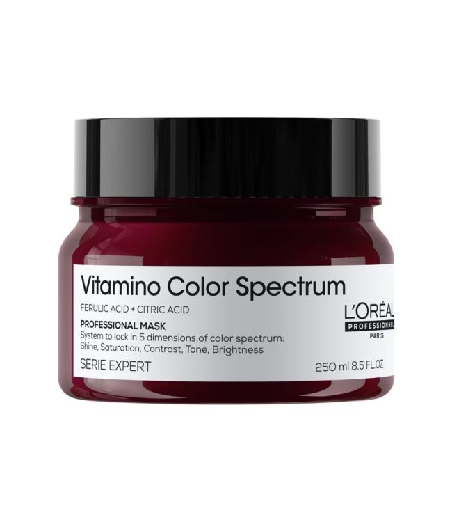 L'Oréal Serie Expert Vitamino Color Spectrum Mask 250ml is een luxe, hydraterend haarmasker speciaal voor gekleurd haar. Geniet langer van een mooie haarkleur en geef gekleurd haar een prachtige glans! Dit diep verzorgende masker verzorgt en verzacht alle haartypes. Het masker versterkt het haar en creëert een ultra-glans. Met Vitamino Color Spectrum vergrendel je de haarkleur in je lokken voor tot wel 100 dagen langer een mooie, levendige haarkleur.