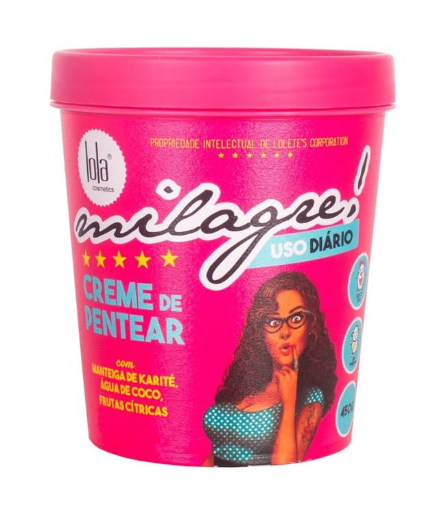 Lola Cosmetics Milagre! Curl Combing Cream 500gr. is een multifunctionele crème die dagelijks op verschillende manieren gebruikt kan worden. Gebruik als kamcrème, haarmasker of conditioner. De Milagre Combing Cream ontwart het haar gemakkelijk en zorgt voor hydratatie en intense glans. De formule is lichtgewicht en maakt het haar niet vettig. De formule is verrijkt met kokoswater, citrusvruchten en shea boter voor een heerlijke verzorging. Als je krullen haar hebt herken je waarschijnlijk wel dat je niet zomaar je krullen kunt borstelen. Het resultaat is vaak erg pluizig en niet de look waar je naar opzoek was. De all-in-one Combing Cream van Lola Cosmetics is echt een lifesaver. De kamcrème ontwart de krullen en voegt zachtheid en definitie toe. Daarnaast is deze Combing Cream (Creme de Pentear) ook te gebruiken als masker of conditioner. De crème is sustainable, geschikt voor dagelijks gebruik, 100% veganistisch, cruelty-free en vrij van sulfaten en parabenen.