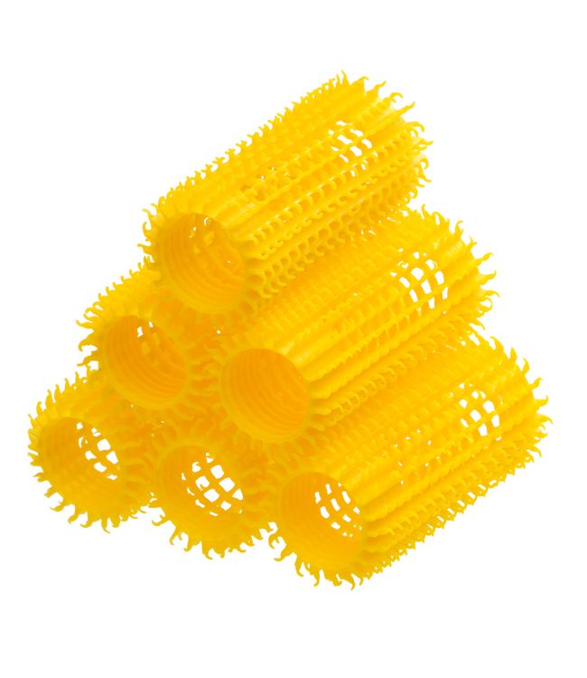 Olivia Garden Jet Set Rollers Geel 31mm 6st. is een set van 6 zelfgrijpende krulspelden. De Jet Set krulspelden hebben kleine rubberen tandjes die het haar "grijpen", waardoor het gemakkelijk en stevig om de roller heen komt te zitten. De Jet Set Rollers zijn ideaal voor permanent, setting & styling. De rollers zijn verkrijgbaar met verschillende diameter. Afhankelijk van het gekozen formaat en de lengte van het haar kun je gaan voor gedefiniëerde krullen, beachy waves of extra volume en textuur. De rollers hebben grote openingen, waardoor je gemakkelijk product kunt uitspoelen en sneller kunt drogen. De rollers hebben een self-gripping oppervlakte waardoor je sneller kunt werken. Het materiaal is zacht en gemaakt van rubber, wat geen schade toericht aan het haar. De rollers zijn eenvoudig te reinigen en zowel geschikt voor professioneel gebruik als thuis gebruik. De gele rollers hebben een diameter van 31mm (inclusief tandjes). Deze krullers zijn ideaal voor medium lang haar met een lengte van 10 tot 29 centimeter.