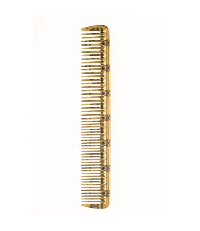 Kam Pegasus Skulleto 202 Styling Barber Comb G-210 Gold is een geweldige kam voor barbers met Flexinite-technologie. Deze kam heeft een speciale uitvoering met gouden kleur en skull print in het zwart. De styling kam heeft gladde, perfect afgeronde tanden die veranderen met temperatuur. Zo zetten de tanden uit tijdens styling met hitte, voor een perfect gladde en schadevrije doorkam. De Skulleto 202 Styling Comb G-210 is ideaal als knipkam en stylingkam voor hoofdhaar en baarden. De kam heeft verschillende tandbreedtes van fijn naar grover voor verschillende haardiktes. Ook is de kam van Pegasus flexibel, sterk, duurzaam en bestand tegen hitte en chemicaliën. Een echte musthave voor elke barbershop!