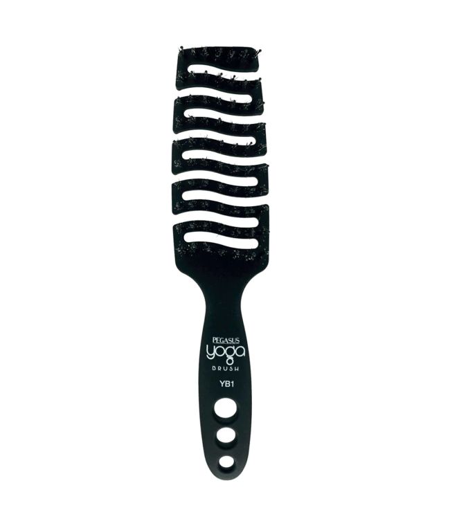 Pegasus Yoga Brush YB1 Boar & Nylon Zwart is een flexibele haarborstel met een mix aan nylon pinnen en 100% boar bristles. Deze flexibele borstel is speciaal ontworpen om de vorm van het hoofd te omhelzen. Het haar wordt moeiteloos glad, ontwart en glanzend. Hierdoor ervaar je geen getrek aan het haar en zal de haarbreuk minimaal zijn. De Yoga Brush is ideaal voor alle haartypes en vooral geschikt voor dik, weerbarstig of krullend haar.