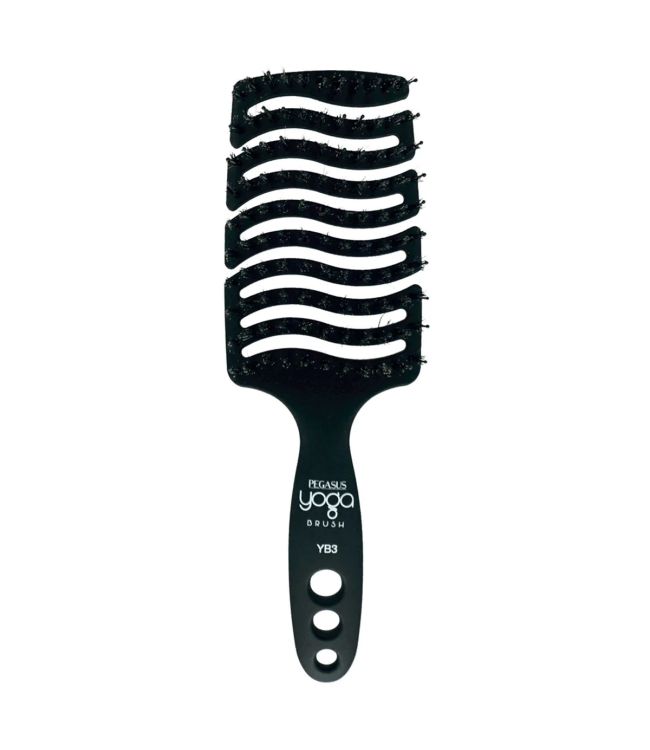 Pegasus Yoga Brush YB3 Boar & Nylon Zwart is een flexibele haarborstel met een mix aan nylon pinnen en 100% boar bristles. Deze flexibele borstel is speciaal ontworpen om de vorm van het hoofd te omhelzen. Het haar wordt moeiteloos glad, ontwart en glanzend. Hierdoor ervaar je geen getrek aan het haar en zal de haarbreuk minimaal zijn. De Yoga Brush is ideaal voor alle haartypes en vooral geschikt voor dik, weerbarstig of krullend haar.
