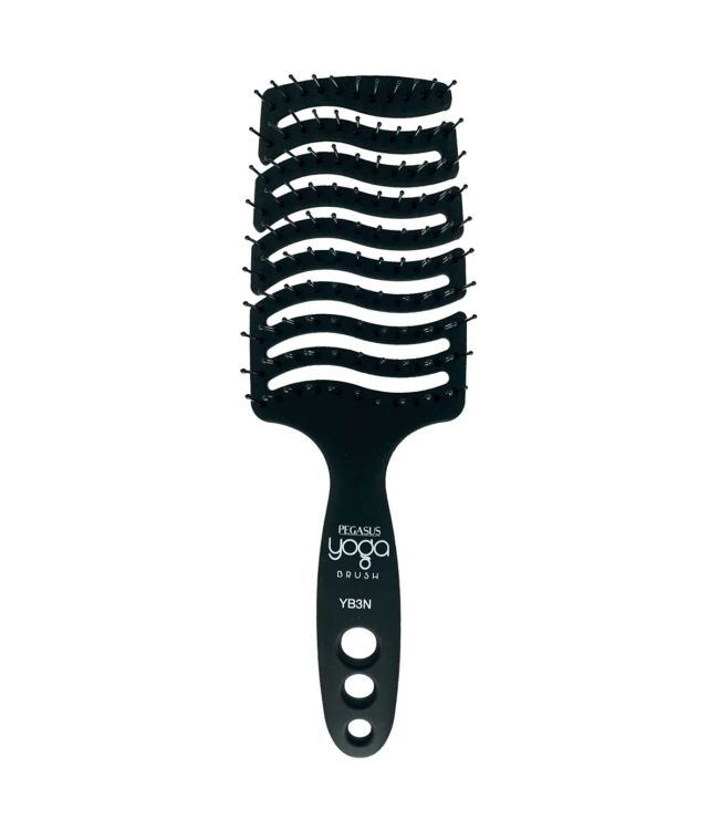 Pegasus Yoga Brush YB3N Boar & Nylon Zwart is een flexibele haarborstel met nylon pinnen. Deze flexibele borstel is speciaal ontworpen om de vorm van het hoofd te omhelzen. Het haar wordt moeiteloos glad, ontwart en glanzend. Hierdoor ervaar je geen getrek aan het haar en zal de haarbreuk minimaal zijn. De Yoga Brush is ideaal voor alle haartypes en vooral geschikt voor dik, weerbarstig of krullend haar.