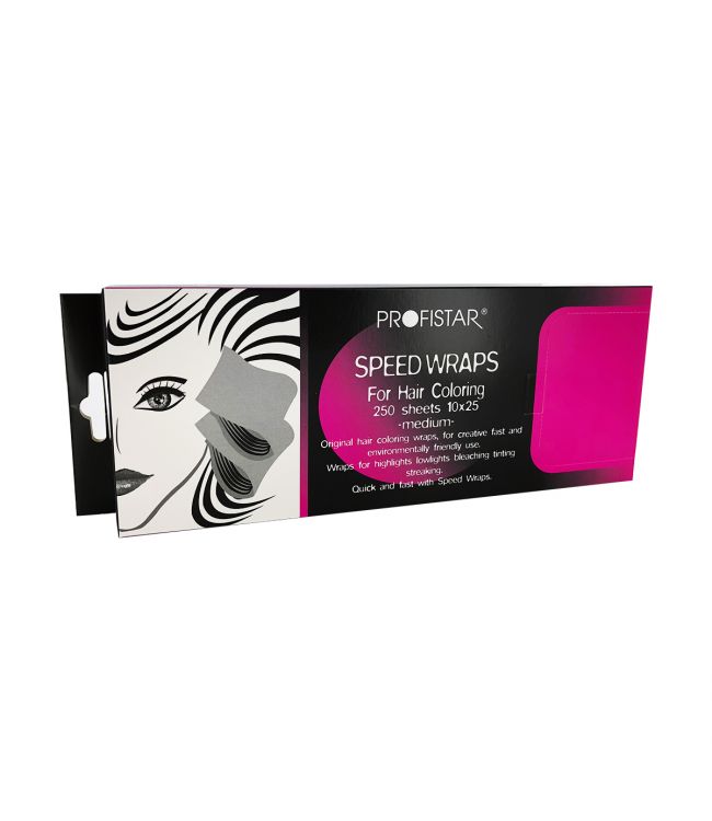 Profistar Hi Lite Speedwraps 10x25cm 250st. is een stuk meche gemaakt van speciaal behandeld papier en geschikt voor alle kleurtechnieken. Deze speedwraps zijn zeer licht in het haar, dus zeer comfortabel voor de klant. Dit papier is geplastificeerd en geisoleerd. De speedwraps zijn verkrijgbaar in de maten 10x17cm, 10x25cm en 10x40cm. De verpakking bevat 250 vellen papier.