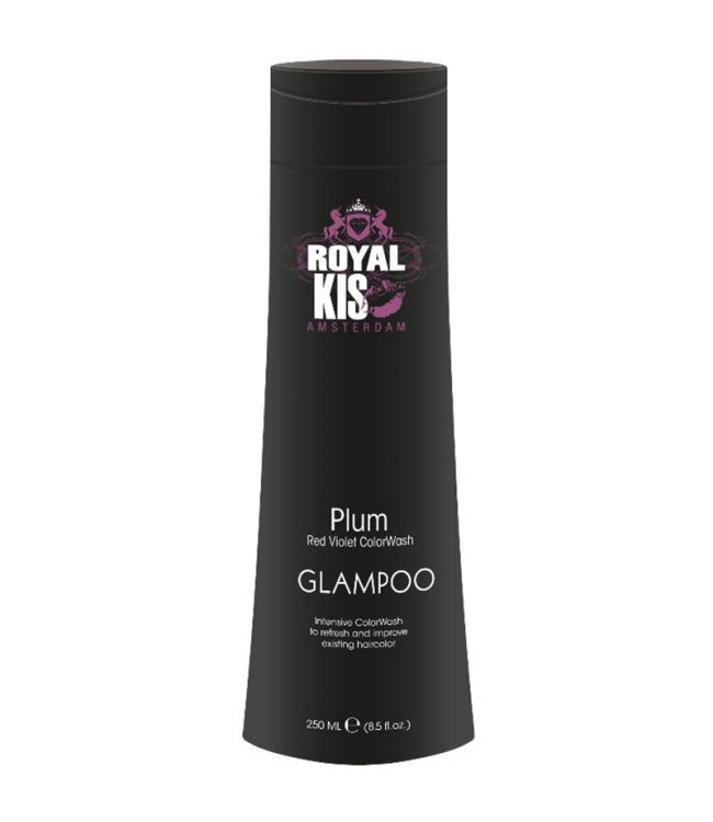 Royal Kis Glampoo Plum (Red-Violet) 250ml is een kleurshampoo die het haar een trendy kleur geeft. Glampoo is verkrijgbaar in vijf verschillende kleuren: Apricot, Blueberry, Cherry, Plum en Raspberry. De haarkleuring in deze shampoo is niet permanent en verdwijnt na een aantal wasbeurten. Op blond haar pakt de kleur felst uit. Meng de Glampoo met normale shampoo voor pasteltinten.