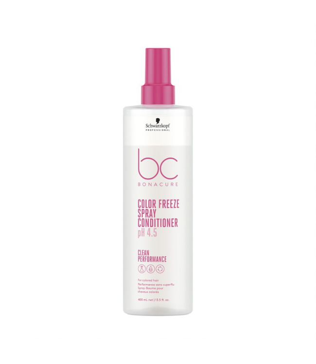 Schwarzkopf Bonacure Color Freeze Conditioner Spray 200ml is een conditionerende haarspray voor gekleurd haar. Deze spray van Schwarzkopf gaat kleurvervaging tegen en ontwart gekleurd haar. Color Freeze brengt de haarstructuur in evenwicht tot een optimale pH waarde van 4,5. Dit beschermt de haarkleur en zorgt voor zo min mogelijk kleurvervaging. Een evenwichtige pH-waarde is van het grootste belang om het haar in gezonde conditie te houden. De leave-in conditioner bevat Vegan Keratine om de natuurlijke elasticiteit en inwendige haarstructuur te verbeteren. Vegan Keratine werkt met 9 aminozuren die de haarstructuur daadwerkelijk herstellen in plaats van enkel opvullen.